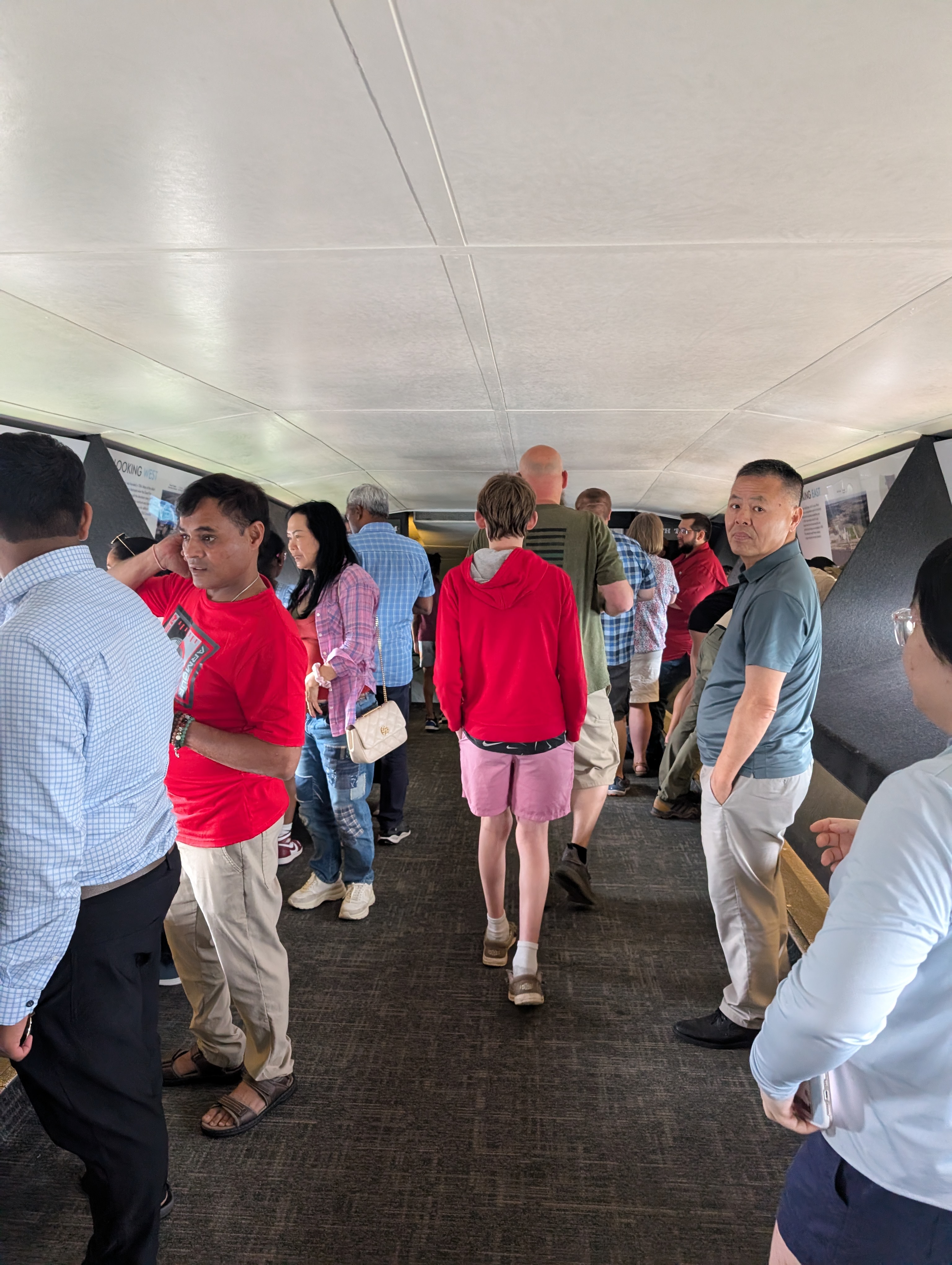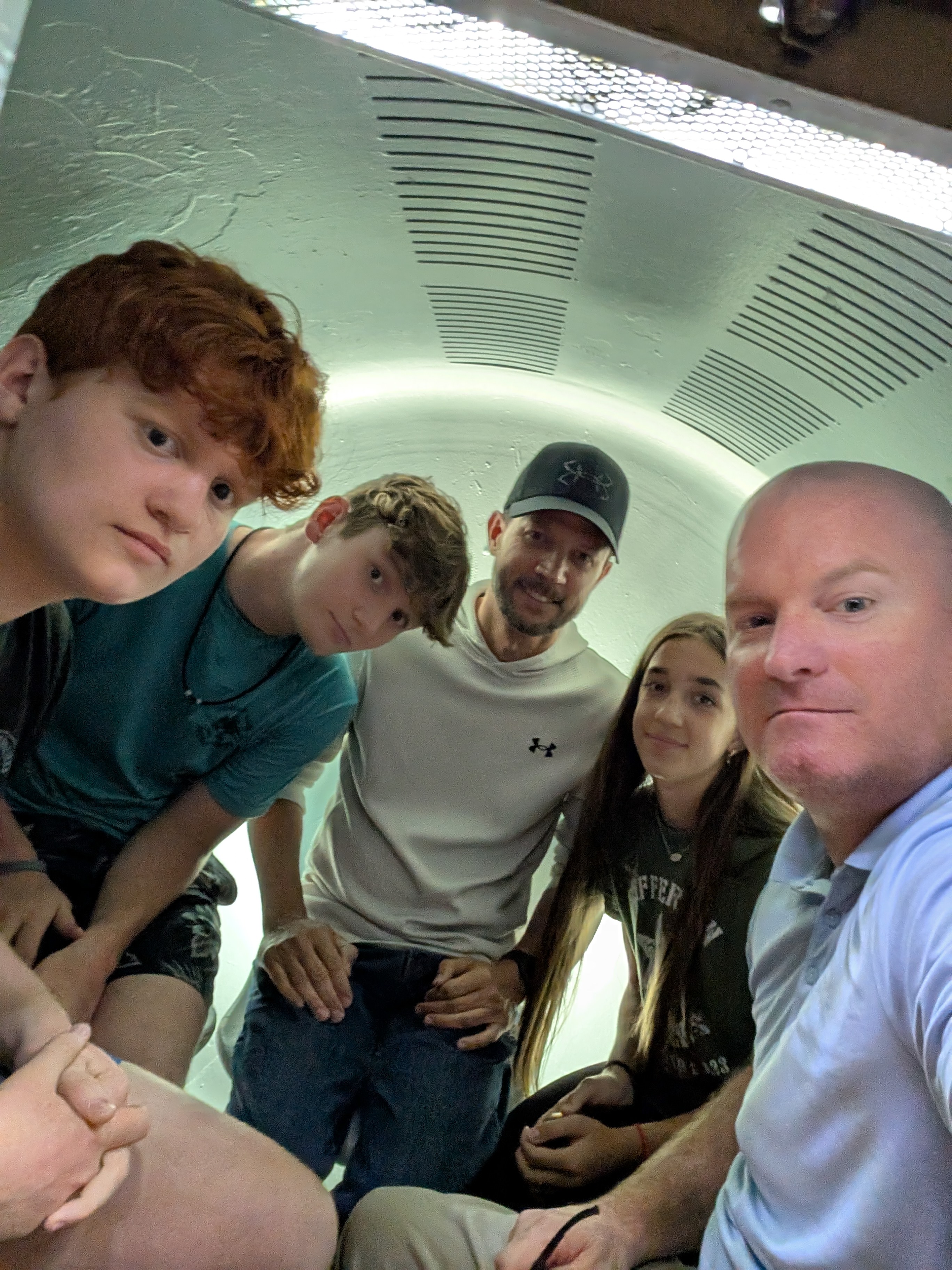 The guide gave a quick, three-minute safety talk, then we watched a five-minute video projected onto the concrete walls. Once the video ended, the doors to the pods opened, and the current group exited. We then entered our tiny pods, which were surprisingly snug, but just enough space for us to sit comfortably as we began our ascent.