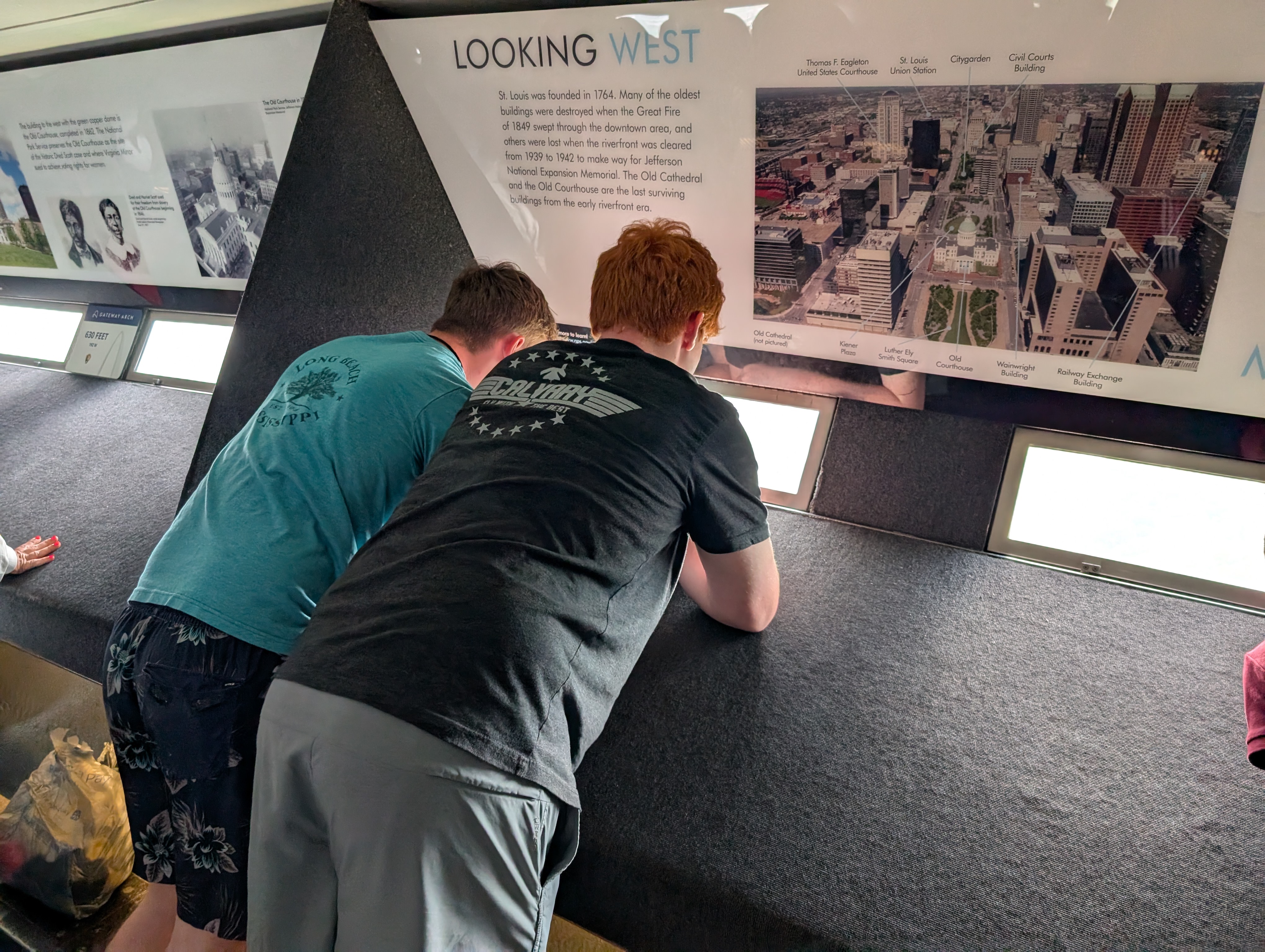 Once we reached the top, the view was incredible. Standing at 630 feet, we had a breathtaking panoramic view of St. Louis and the Mississippi River below. We had about 10 minutes to take it all in, and the boys were on a mission to get their perfect shot. There are four small portholes on each side of the arch, and the boys wasted no time trying to get their spot to look out. It was a bit of a scramble to get a good view, but the excitement in their eyes made it worth the effort.