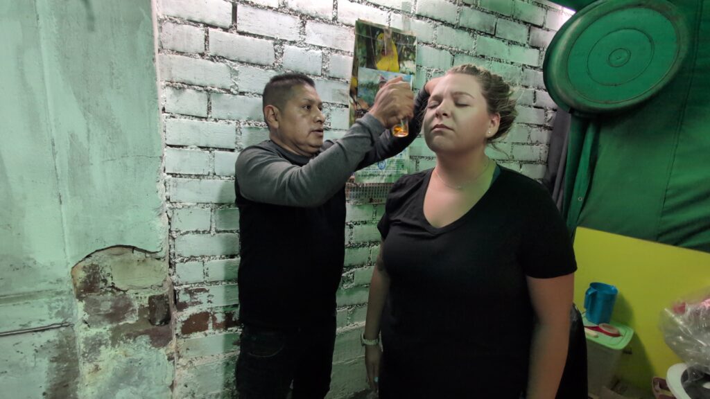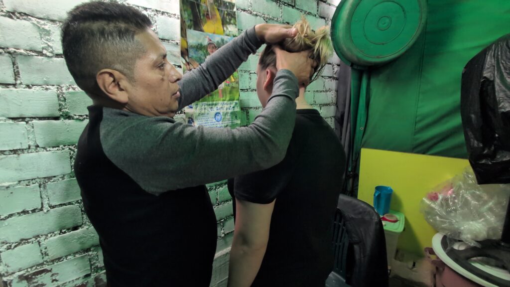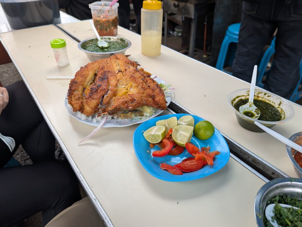 We entered through a wall of fruit vendors, mangoes piled high, bananas stacked like currency, and papayas bursting open like soft, sticky treasure. Hawkers shouted in every direction, offering coca leaves, skewers of grilled meat, sodas, socks, limes, batteries, anything that kept the street alive. Meanwhile, the smells hit in chaotic waves: sweat, citrus, exhaust, hot oil, and rot. On the left, permanent brick restaurants served steaming dishes behind metal gates. On the right, sidewalks morphed into makeshift kitchens, smoke curling through the crowds. Each alleyway unveiled a new layer of the market. As we ventured deeper, the noise grew louder and the energy more intense. To put it bluntly, you could film for hours and still miss half the story. Every 20 minutes or so, Beth and I paused with a beer, not because we needed it, but because chaos like this deserves reflection. One corner became our dining room: plastic chairs jammed against a stained wall while vendors plated fried fish topped with pickled onions and mystery sauces. I didn’t ask what was in them. Instead, I dipped and trusted the moment.