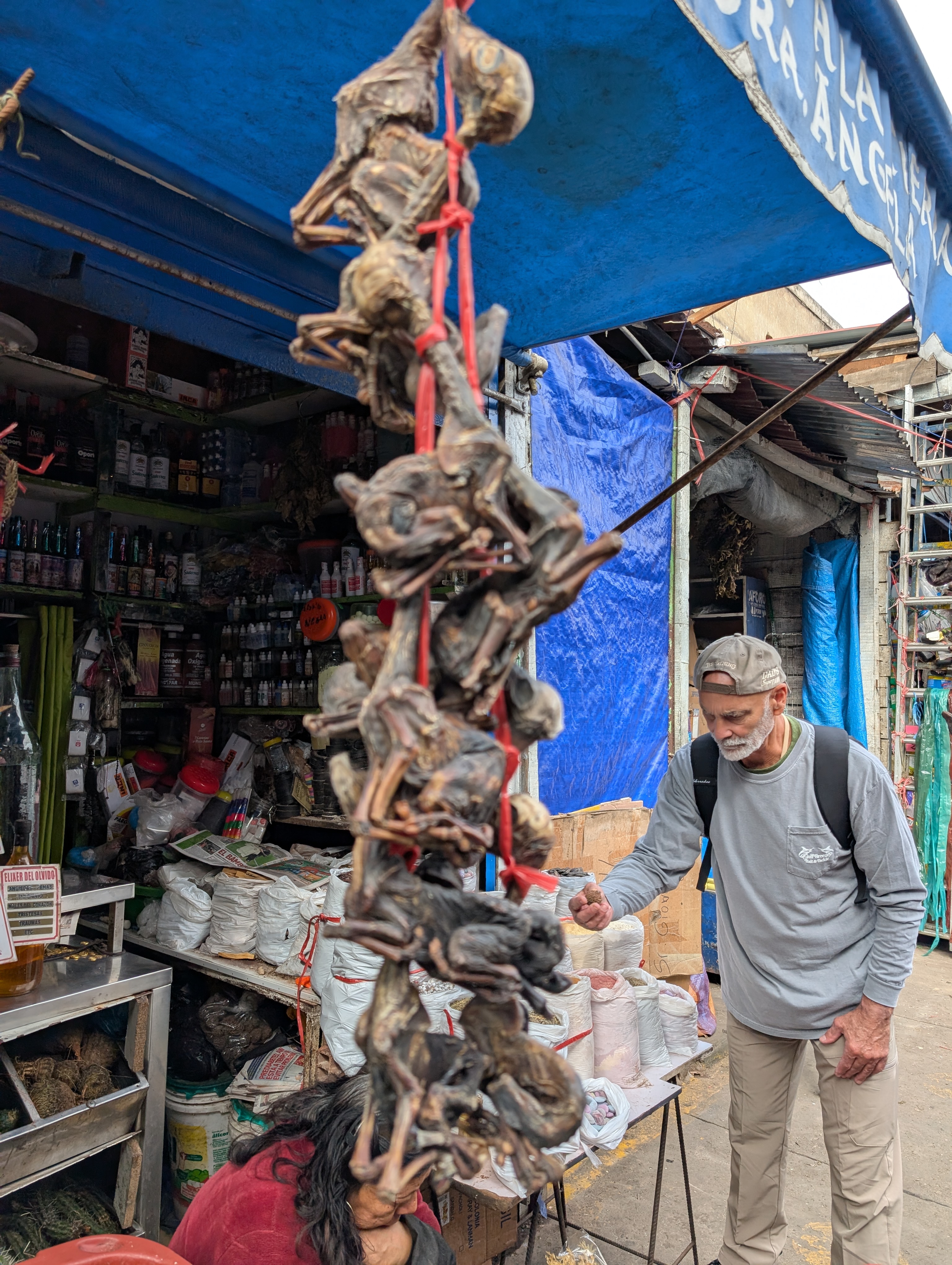 And there they were, six dried llama fetuses swaying overhead, vendors stringing them like eerie wind chimes above a flickering stall. The woman behind the table didn’t look like a witch. She looked like someone who’d seen everything and learned to speak less. We approached slowly. Asked questions carefully. She answered when it suited her. Steve, my friend, was mesmerized. He used broken Spanish and Google Translate, and little by little, she warmed to us. Then she handed over protective charms, explaining each one’s purpose. Eventually, she offered me a dried chicken head wrapped in a green velvet pouch. Said it would keep me safe for the rest of my journey.