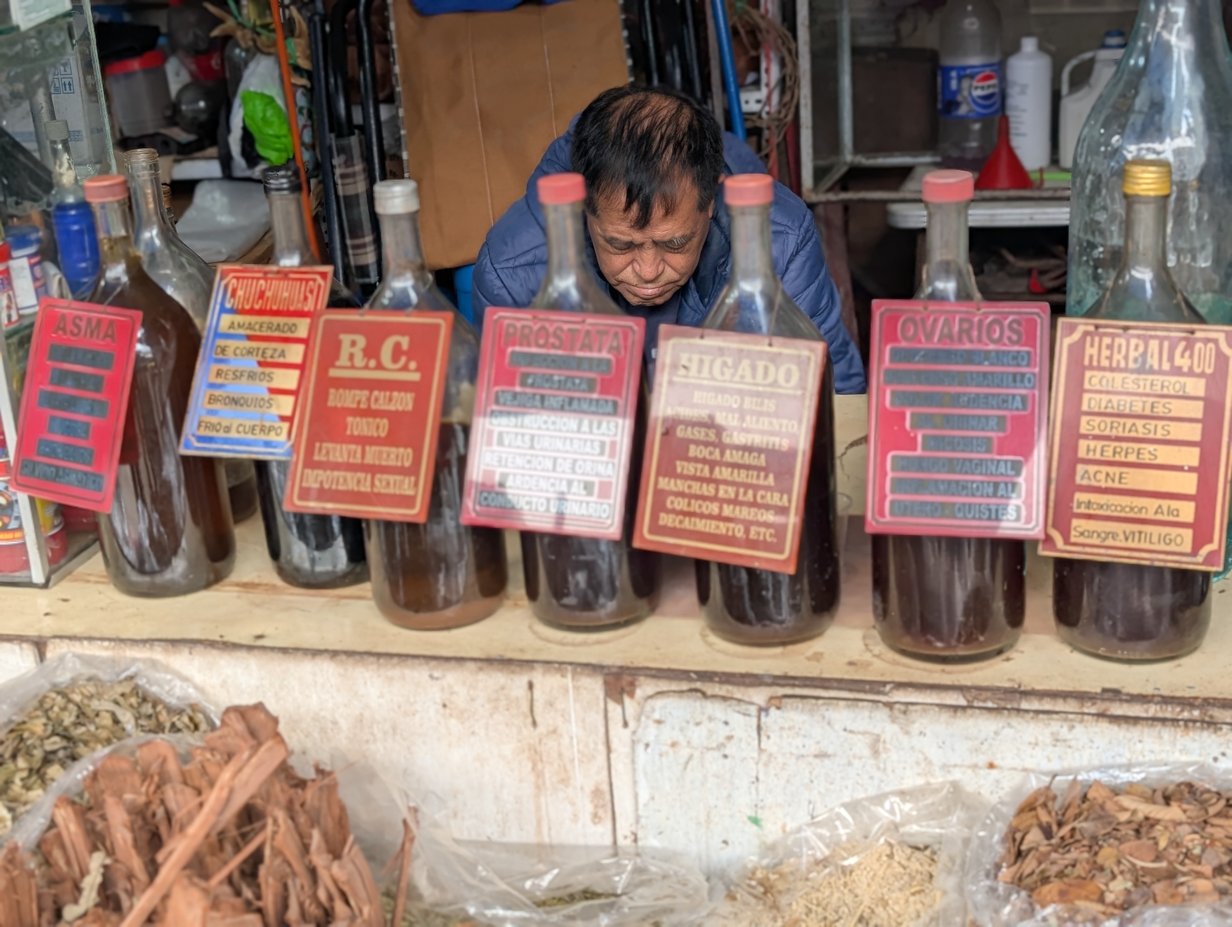 I came to the Mercado Zone of Lima with one mission: spices. I’d promised my friend Bill Rester back in Long Beach, who is the brains of a local restaurant that is making huge waves with their food. He is also the chef at Radish, He asked me to bring back any spices that he has never touched. And I found it. Vendors had tucked spice stalls into shadowed corners, where powders shimmered in colors I couldn’t name and scents stopped me mid-stride. I stuffed bags until my backpack swelled. However, I was chasing something deeper too: the Witches’ Market. It’s not marked on any map. You don’t just arrive, you earn directions. I asked six different vendors; most ignored me. Eventually, one elderly woman met my eyes and said nothing. She simply nodded toward a narrow side alley.