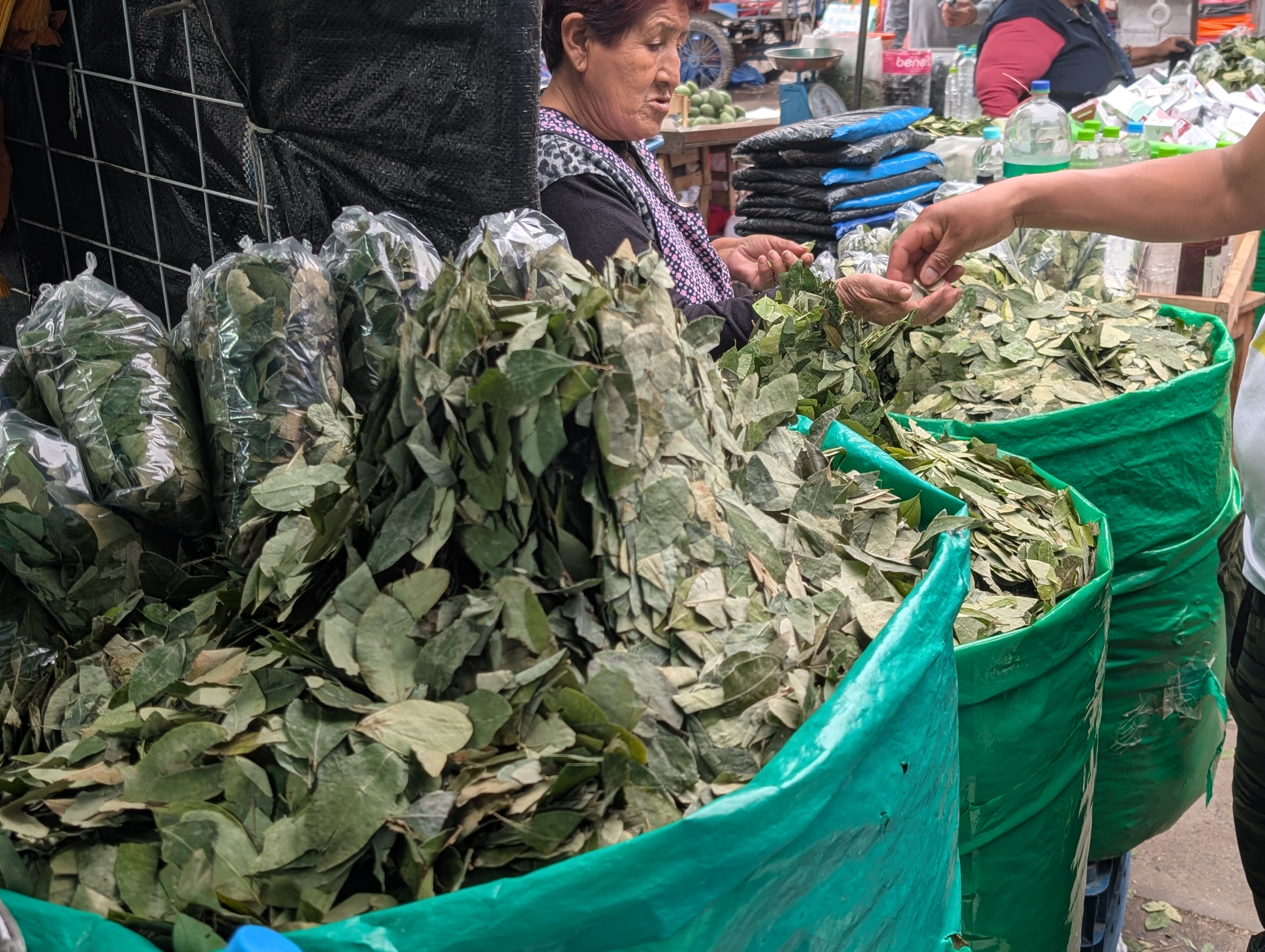 A man purchases coca leaves from a street vendor at a market in Lima, Peru. Multiple barrels filled with dried coca leaves line her stall, while surrounding vendors and shoppers create a bustling backdrop